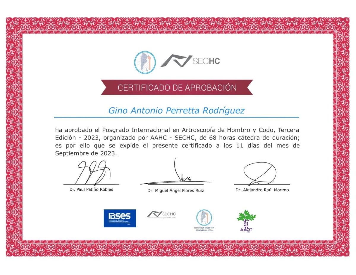 - Postgraduate International Certification in Shoulder and Elbow Arthroscopy: He successfully approved the Posgrado Internacional in Artroscopía de Hombro y Codo. 2023