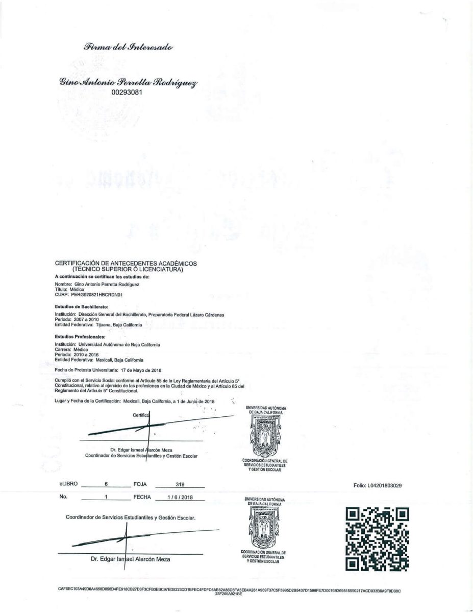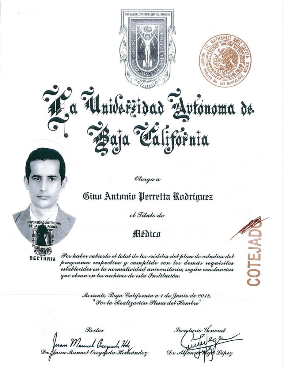 - Medical Degree: Universidad Autónoma de Baja California (UABC), June 1, 2018. His professional studies at UABC ran from 2010 to 2016.